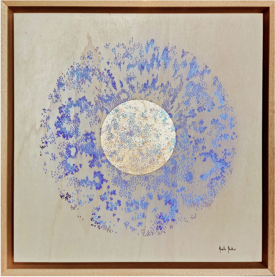 D’un geste délicat, avec finesse et précision, elle perfore des essences fines de bois et explore la technique du pointillisme en bas-relief.